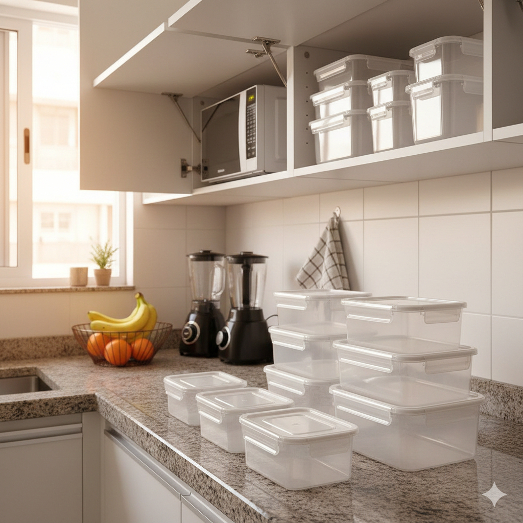 Potes seguros, organizados e resistentes — do freezer ao micro-ondas.