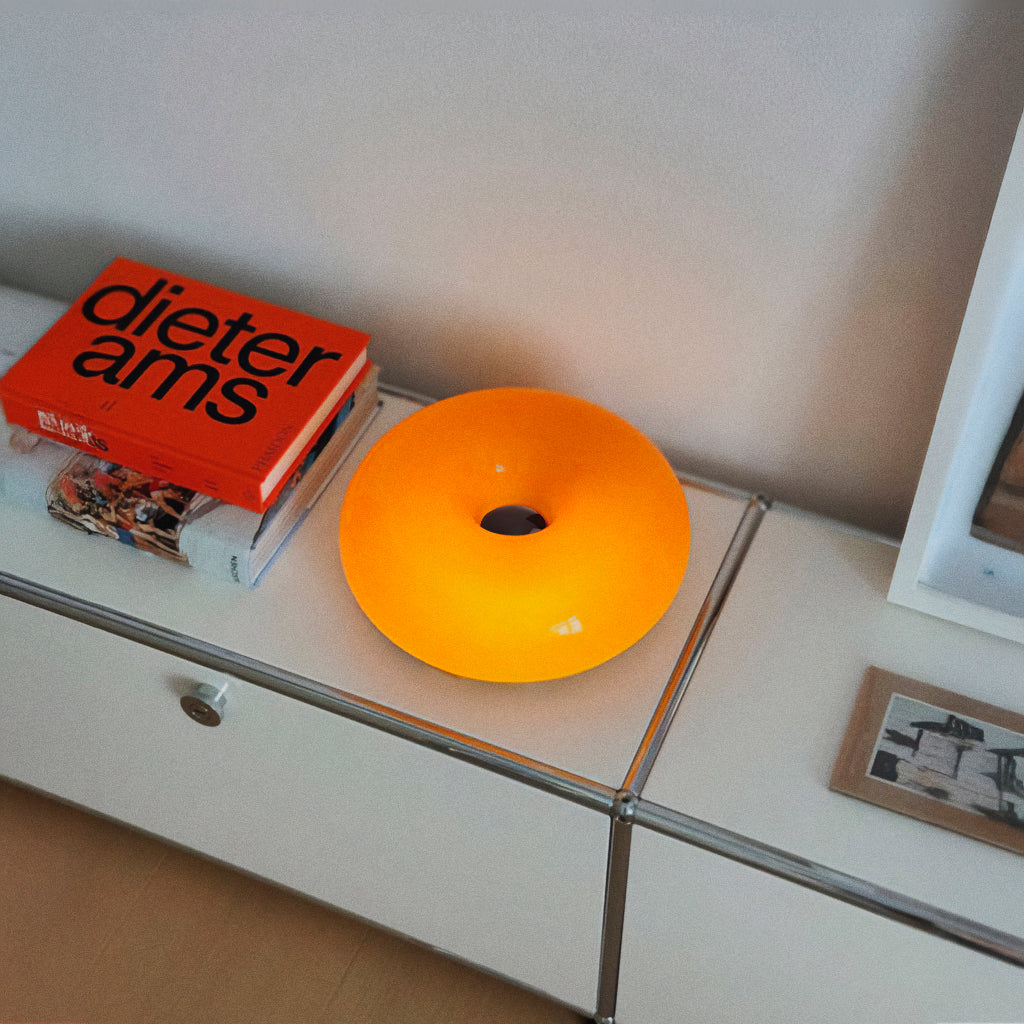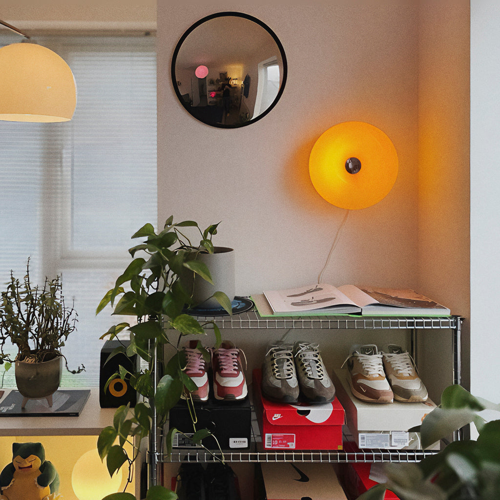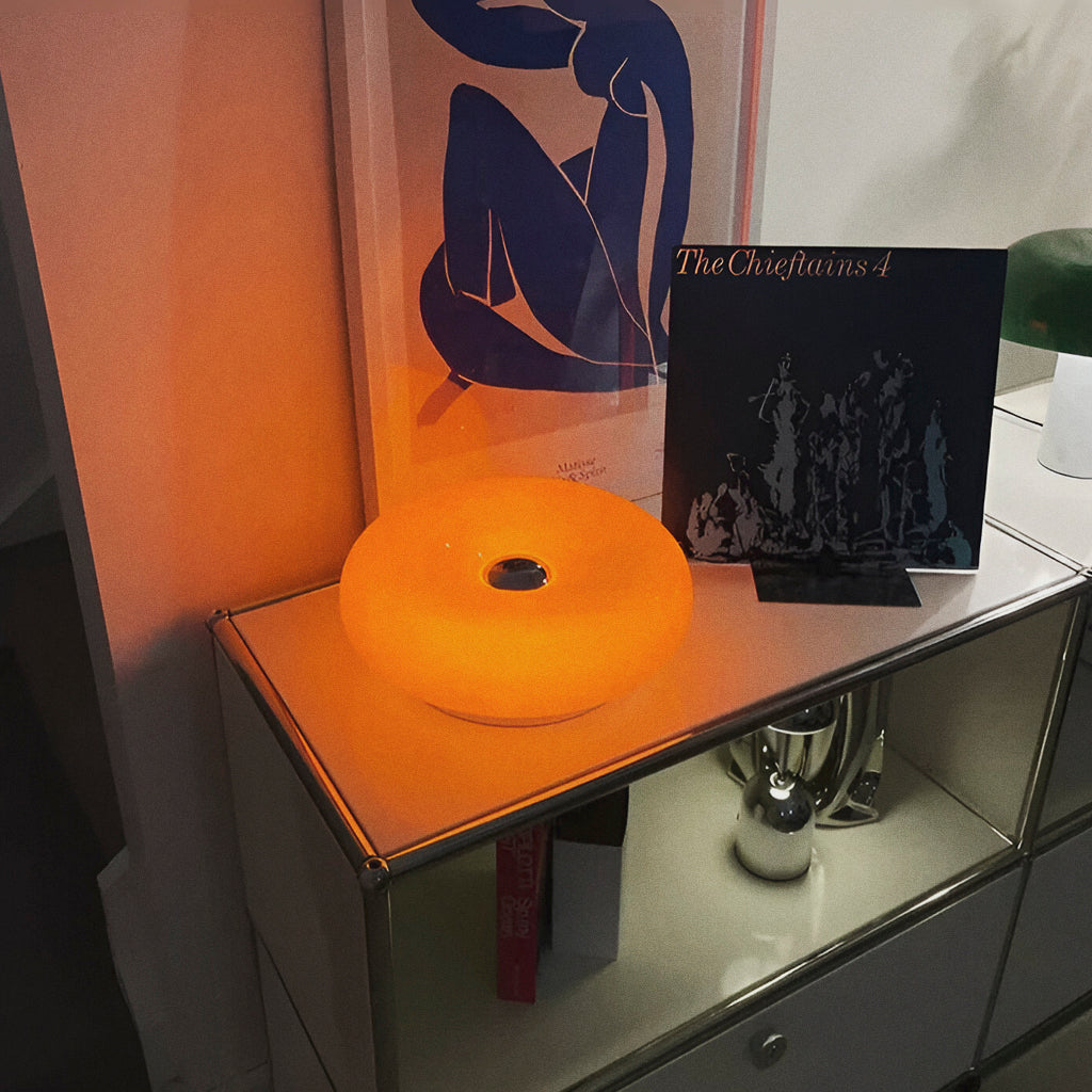 O casco em vidro laranja difunde a luz por todo o cômodo, transformando instantaneamente